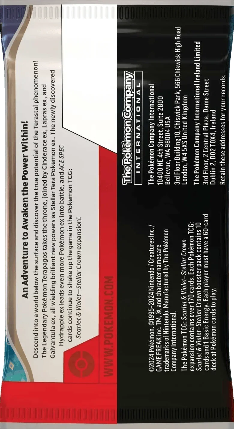 Descend into a world below the surface and discover the true potential of the Terastal phenomenon! The Legendary Pokémon Terapagos takes the throne, joined by Cinderace ex, Lapras ex, and Galvantula ex, all wielding brilliant new powers as Stellar Tera Pokémon ex. The newly discovered Hydrapple ex leads even more Pokémon ex into battle, and ACE SPEC cards continue to shake up the game in the Pokémon TCG: Scarlet & Violet—Stellar Crown expansion.